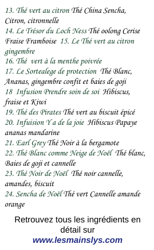 Vous aurez le plaisir de déguster les thés et tisanes ci joint en image.